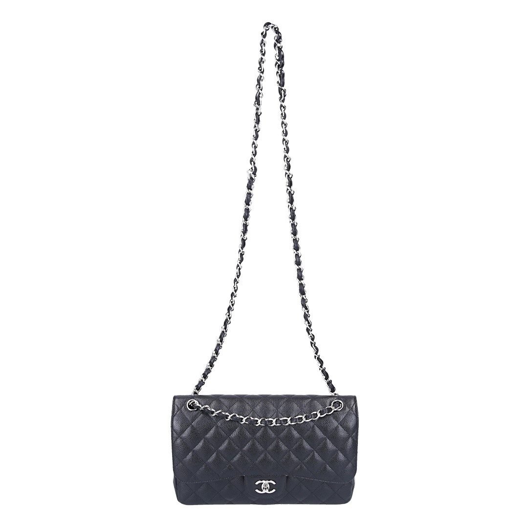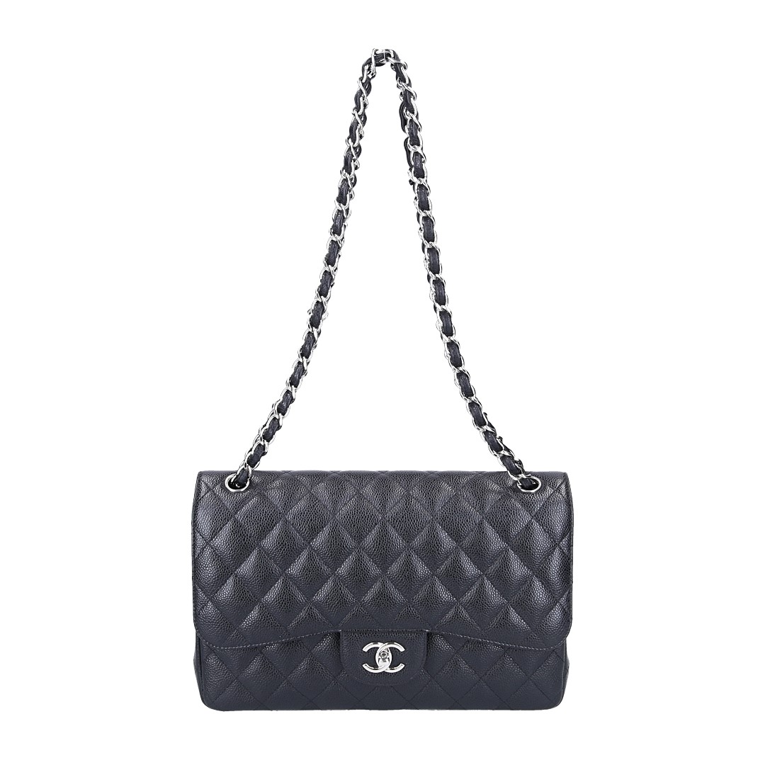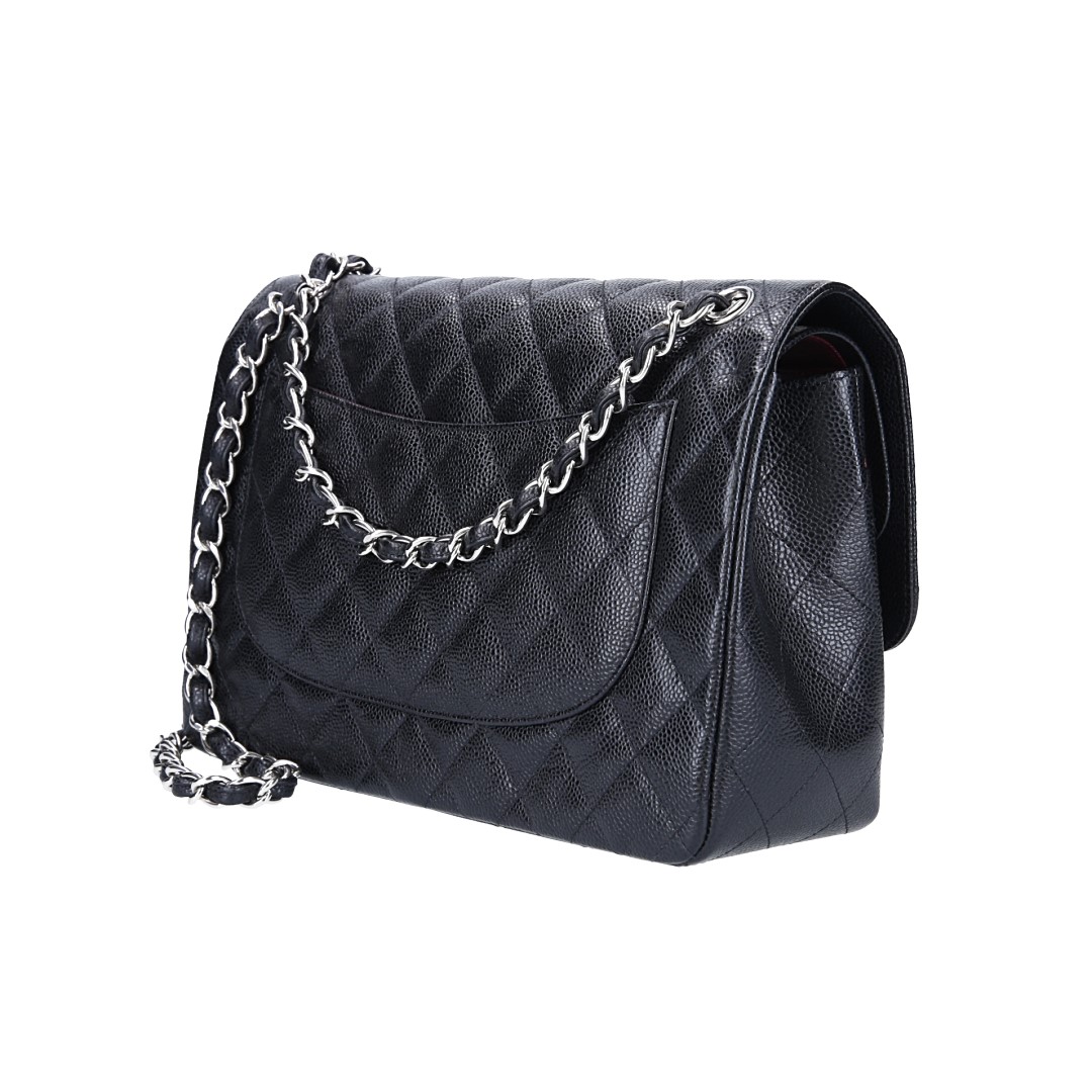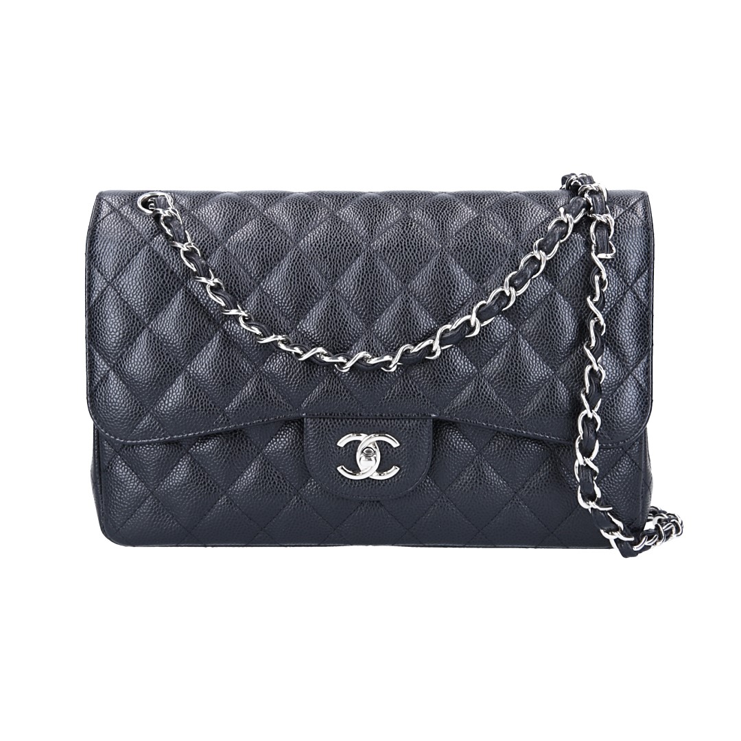 Die hier angebotene Timeless Flap Handtasche in der Größe JUMBO begeistert durch eine klassischen Farb-/Materialkombination und silberfarbenenen Metall-Elementen.