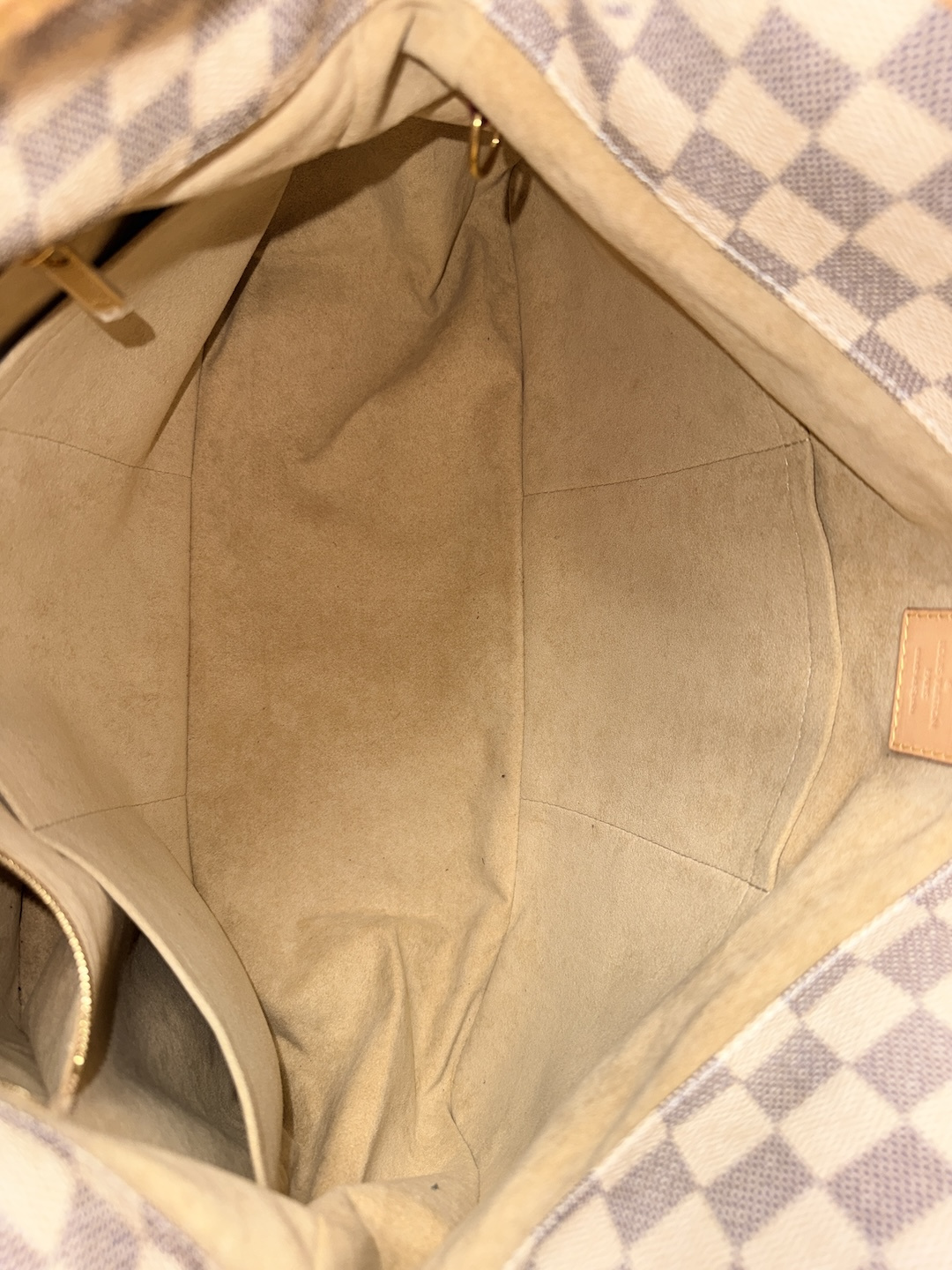 Damier Azur Canvas, naturbelassenes Rindsleder; goldfarbene Metallelemente; Mikrofaser-Material