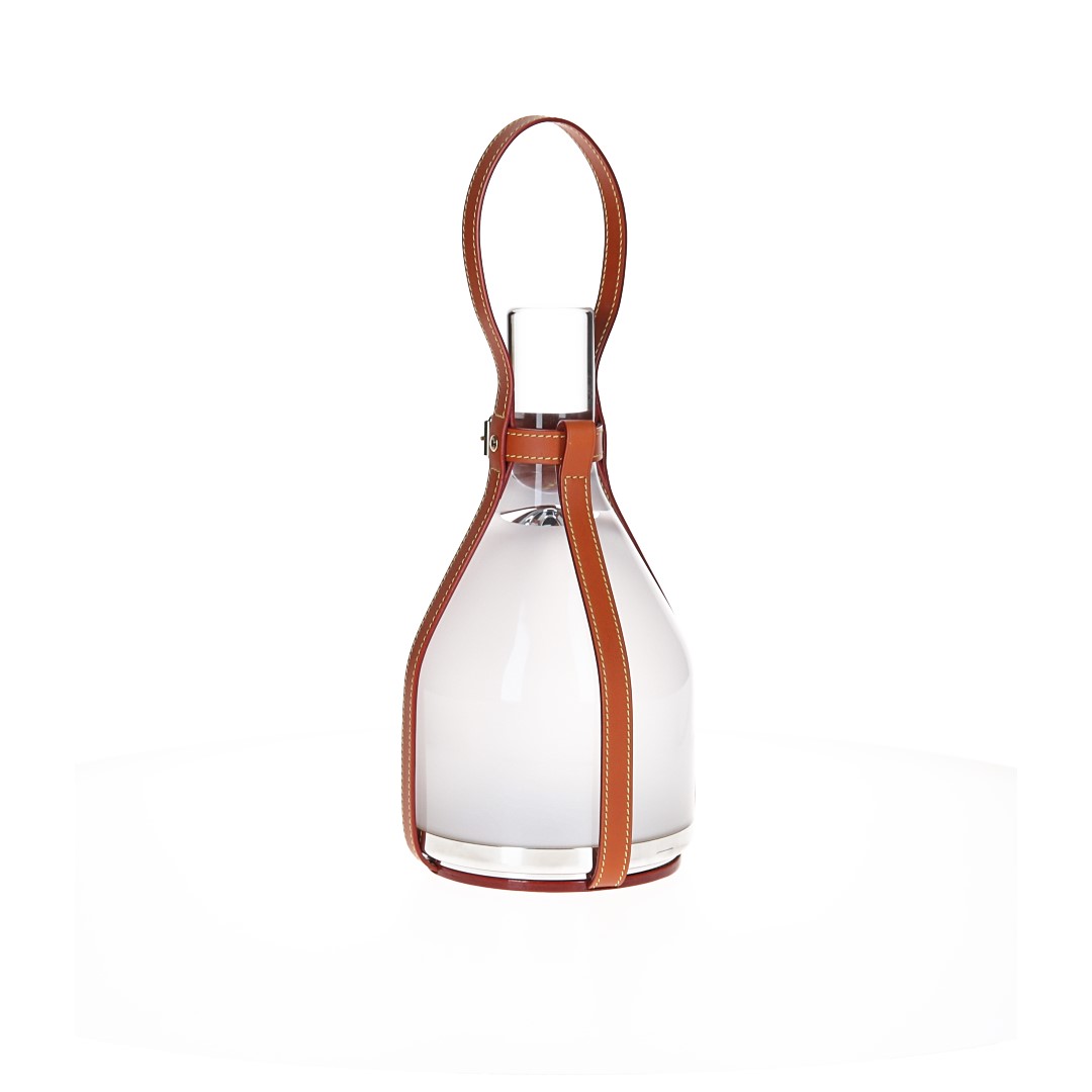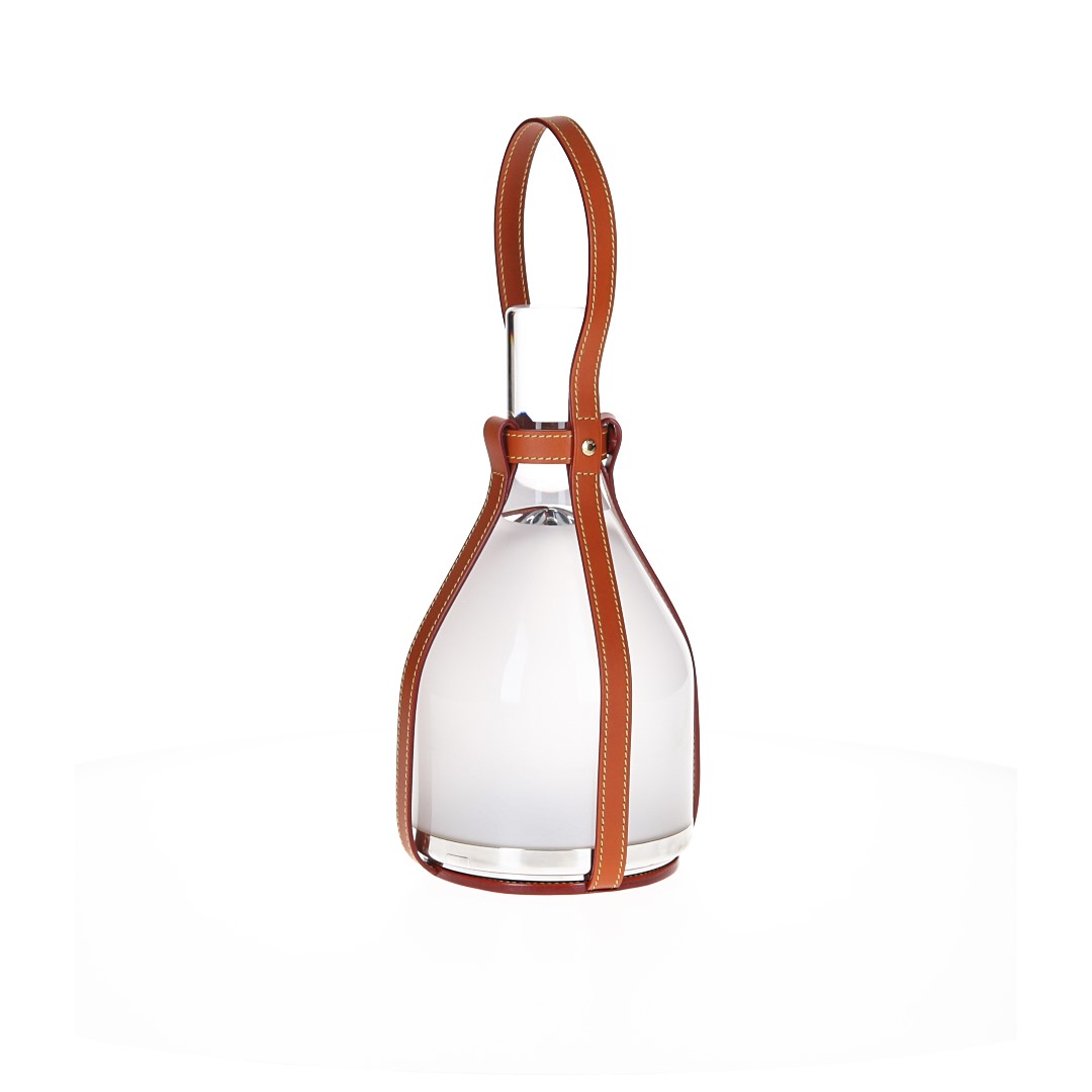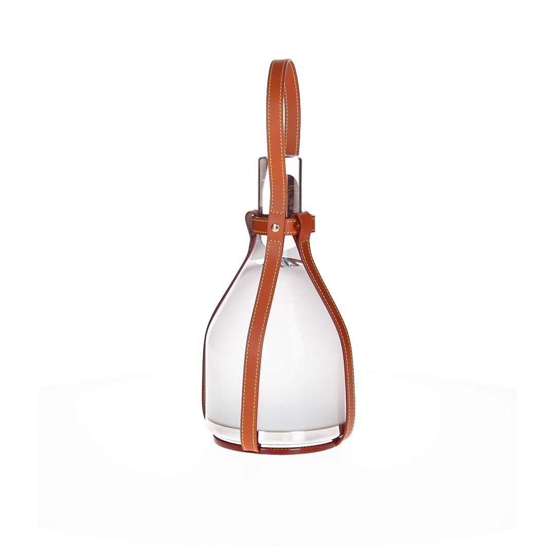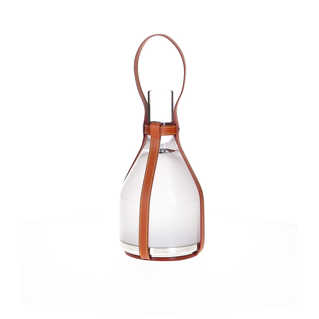 Nomade-Leder, mundgeblasenes Milch-Glas, Aluminium, LEDs, Li-Ionen Akku, goldfarbenes Metall